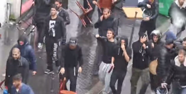 Following violent anti-Israel clashes on Sunday in Paris in which hundreds of Jews were trapped in a synagogue, a video has emerged showing what appears to be pro-Israel demonstrators tearing through the street in front of the shul, carrying sticks, and throwing tables and chairs in the direction of pro-Palestinian protesters :