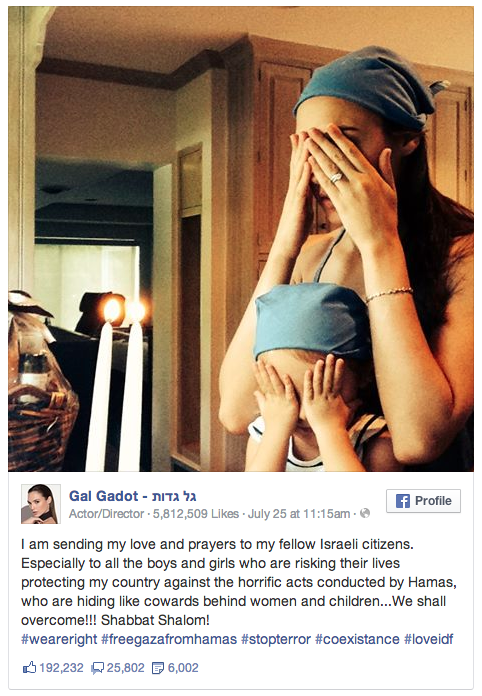 Gadot’s Facebook post, posing with one of her daughters, received 5,600+ shares and 187,000+ likes, and has received comments ranging from support, e.g. “Hamas is using the people of Gaza as pawns, as shields,” to condemnation: “Considering Israel is bombing schools and hospitals I’d say it’s pretty bold saying such things about Hamas.” The 29-year-old actress was born in Rosh HaAyin, Israel, a small city whose name translates to “fountainhead”—her first name, Gal, translates to “wave”—and grew up in a Jewish household.