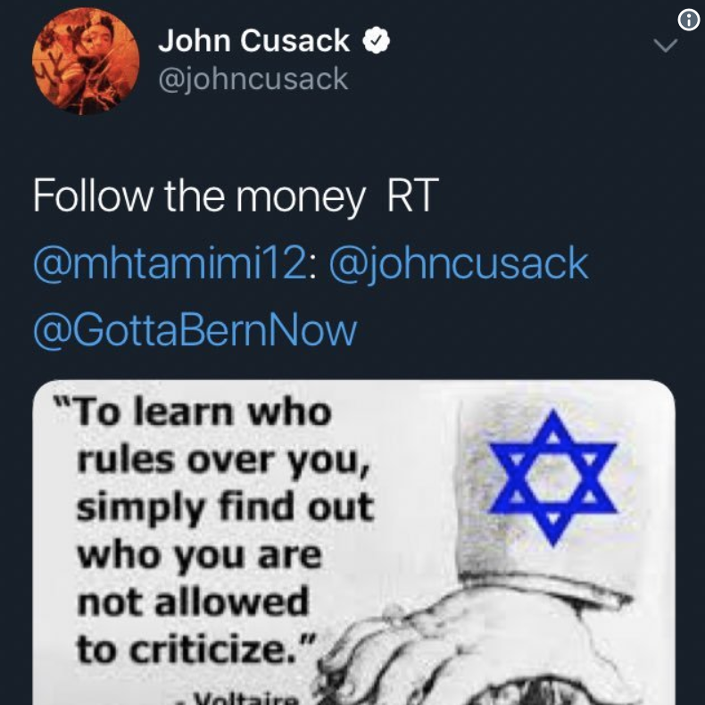 Actor John Cusack deleted a tweet containing an anti-Semitic image Monday, blaming the initial post on a “bot.” The image Cusack posted depicted a giant hand bearing a Star of David enveloping a group of people, accompanied by the words “To learn who rules over you, simply find out who you are not allowed to criticize,” which it attributed to Voltaire, with Cusack adding, “Follow the money.” The quote, frequently misattributed to the French satirist, was in fact said by American white nationalist Kevin Alfred Strom. READ MORE